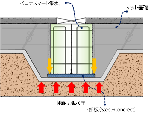 - ·集水井の下部板は地耐力と水圧に耐え、マット基礎は集水井を下部板を支持